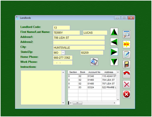 Below is a sample Landlord Screen. Store instructions regarding a landlord's properties on this screen and view a list of properties owned by this landlord.